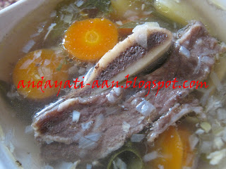 Untuk bumbu halusnya aku tambahkan ½ sdt gula, dan aku tambahkan juga kentang dan wortel masing2 satu biji. Aku masaknya pakai slow cooker, dan pas mateng ada tamu jadi kita suguhkan sekalian kita makan siang. Sisa semangkuk kecil (untung masih ada iganya) inilah yang kefoto. Kurang segar penampakannya karena sup sisa ini tetap di dalam slow cooker yang lupa dicabut colokannya selama berjam-jam.